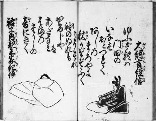 百人一首 | 日本古典籍データセットから。 大納言經信だいなごんつねのぶゆふざれは 門田かどたの いなば おとつれて あしの まろやに 秋あきかぜぞふく字母 由不左禮八 【門田】乃 以奈者 於止川連天 阿之乃 末呂也尓 【秋】可勢曽不久 ※ 左縦書き 祐子内親…