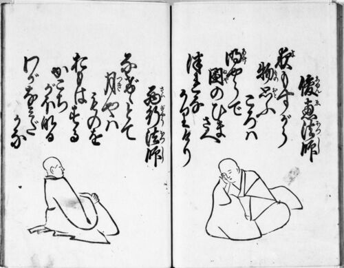 百人一首 | 日本古典籍データセットから。 俊恵法師しゆんゑほつし夜よもすがら 物思ものおもふ ころは 明あけやらで 閨ねやのひま さへ つれな かりけり字母 【夜】毛寸可良 【物思】不 己呂八 【明】也良天 【閨】乃比末 左部 津連奈 可里个利 西行法師さ…